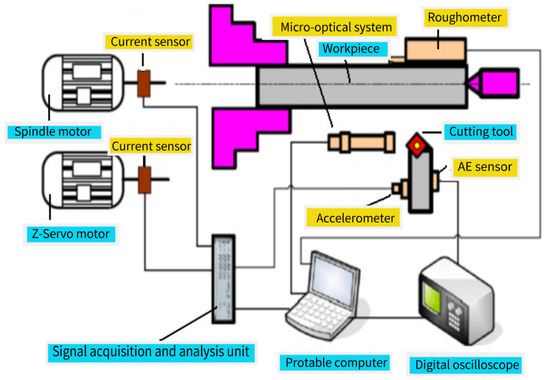 - Bhuiyan, M.S.H.; Choudhury, I.A.; Dahari, M. Monitoring the tool wear, surface roughness and chip formation occurrences using multiple sensors in turning. J. Manuf. Syst. 2014, 33, 476–487. [Google Scholar] [CrossRef]