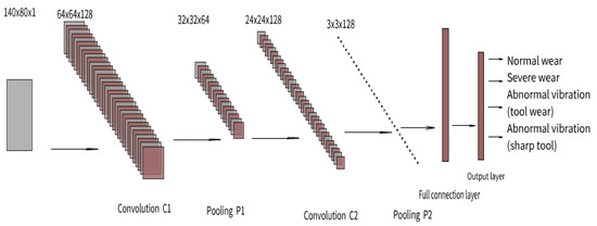 | [125] | LeNeT model is adopted and improved. The model is composed of an input layer, two convolutional layers, two pooling layers, a fully connected layer and an output layer, with 4 types of output. | Milling wear experiments were carried out on DM1007 vertical machining center under seven different working conditions. The self-built system is used to collect the vibration and current signals of the spindle, including the single-phase current signal of the spindle motor and the acceleration signal of the spindle x-direction and y-direction. The sampling frequency is 6.4 KHz. | The experimental results show that the lowest accuracy rate is 87.7%, and the highest is 92.3%. |