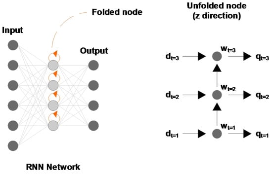 Long short-term memory (LSTM) networks were created as a variant of recurrent neural networks (RNNs) with a differentiated architecture. RNNs were firstly introduced in 1990 [13,14]. They were inspired by typical feedforward networks, but were tweaked in order to efficiently handle data that were in the form of time steps. In order to achieve that, RNNs are equipped with recurrent (feedback) connections as well. RNNs are able to operate not only on single data patterns (such as images), but also on sequences of data, such as video or speech. Due to this new architecture, RNNs presented the ability to efficiently handle time-series problems. A representation of an RNN is depicted in Figure 1 [15]. These networks were found to be difficult to train, as they were prone to numerical instability problems such as the exploding and/or vanishing gradient. This led to the development of the LSTM networks and the so-called bi-directional LSTMs [16] that are used in this study. LSTMs include an extra memory value that is trained on a specific number of time steps. This temporary memory acts as a hidden state that is cycled over the time steps.
