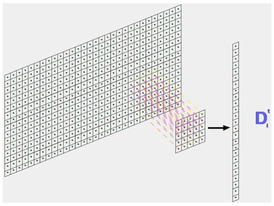 It is noted that in the remaining part of this work, the density of an FE is defined as d rather than x, which is used in Section 2. In an attempt to improve the performance of the network, a decision is made to increase the features of the input instead of just using the density of one FE. The additional features that are used as inputs are the density values of neighboring finite elements of the element to be classified. In detail, apart from the density of the FE whose final density is to be classified, the densities of extra 24 FEs that are the closest to it in terms of center weights coordinates are also used as features of the networks’ inputs. For example, in case of an element , the density recording input at the tth iteration is presented in Equation (6).