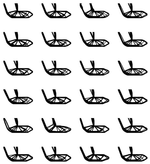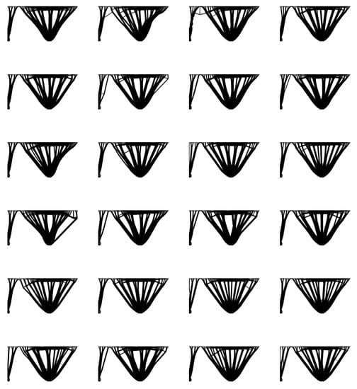In test example B—the design domain that can be seen in Figure 7 that is of shape with dimensions —fully fixed boundary conditions at the top left edge along the x axis are implemented, while a concentrated point load P at the right edge of the design domain is applied along the vertical y axis, defining the loading conditions. With respect to the structured FE discretization ratio, while the target volume percentage is set equal to . A set of 24 randomly chosen images of the optimized results of this example as produced by MLGen can be seen in Figure 8. Similar to the previous test example, these are of equivalent value with respect to the design criteria chosen during the optimization problem formulation.
