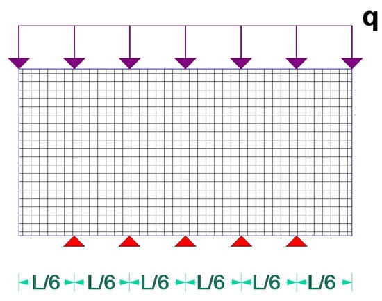 The next example is labeled test example D, and the corresponding design domain is presented in Figure 11 that is also of rectangular shape with dimensions . The support conditions correspond to two fixed points at the bottom edges located at the two opposite corners of the design domain, while the loading conditions refer to a concentrated load at the middle of the bottom edge applied along the vertical y axis. The desired volume fraction is equal to , and the structured FE discretization ratio is equal to . The corresponding set of randomly chosen optimized shapes by means of the MLGen methodology is presented in Figure 12.