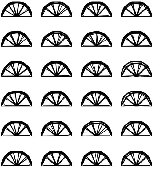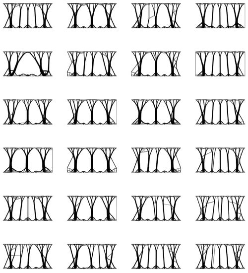 In Figure 9, the design domain that is also of rectangular shape with dimensions and the corresponding loading and support conditions for the third test example C are presented. In detail, five fixed joints are located at the bottom edge of the design domain and they are equally distributed along the x axis. A load distributed along the horizontal x axis at the top edge of the design domain is applied toward the vertical y axis.The target volume percentage is set equal to , and the structured FE discretization ratio is equal to . The randomly chosen set of 24 optimized solution for this test example out of the 161 ones generated through the implementation of MLGen methodology is presented in Figure 10.