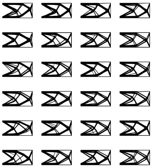The design domain for the case of test example A can be seen in Figure 5 that is of rectangular shape with dimensions ; it is supported by two fixed joints with the first one located in the bottom left corner on the x axis and the second one also placed on the bottom edge along the x axis at a distance of from the other support. The loading condition refers to a load distributed along the top edge of the x axis applied toward the vertical axis y. For this test example, the desired volume fraction is set equal to , while the structured FE discretization ratio is equal to . Out of the 161 optimized designs that are generated by means of the MLGen methodology for this test example, a randomly chosen sample of 24 optimized designs can be seen in Figure 6. As it can be observed, the MLGen methodology generates multiple different, but equivalent in terms of performance, optimized designs.