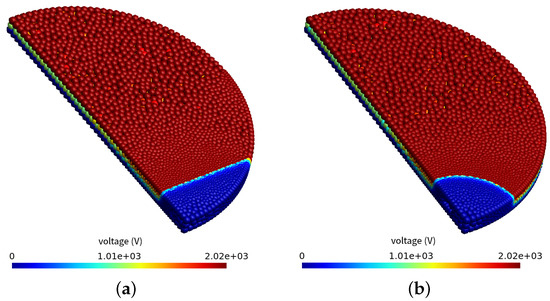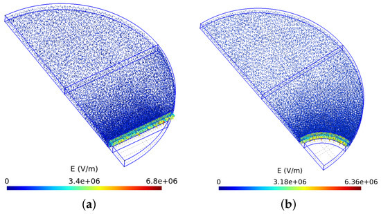The same statement applies here as for the calculated electric potentials. The given Dirichlet boundary condition varies only in its magnitude, not in the area over which it is specified. The character of the electric field intensity distribution is the same for any size of , differing only in the magnitude of the electric field intensity vectors. This visualization of the calculated electric field strength distribution provides only qualitative information about the conditions that occur during the polarization process.
