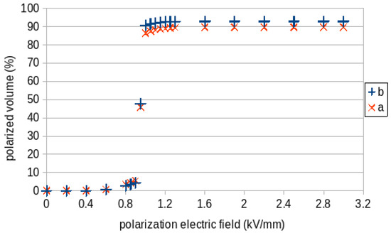 The graph in Figure 9 shows the dependence of the volume polarized in the thickness direction of the transducer on the magnitude of the polarization field . In the case of variants (a) and (b), the volume polarized in the thickness direction is clearly lower than the total polarized volume of the transducers. An interesting result can be seen in the interval (0.8–0.9) kV/mm of the polarization field. In this interval, an increase in the polarized total volume is evident from the graph in Figure 8, whereas in the graph in Figure 9, which shows the dependence of the volume polarized in the thickness direction, this increase is not apparent.