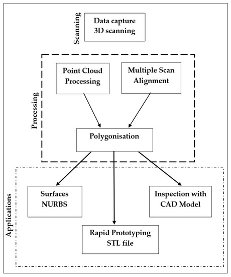 The development of technologies in reverse engineering opens new horizons in the areas of quality assurance and control. Great progress is being made with non-contact devices, the accuracy of which is beginning to approach that of conventional contact coordinate measuring instruments. One of their main advantages is the scanning speed; the systems can scan the measured object several times faster, which ultimately means increased productivity and the ability to control a larger number of products. Another advantage of contactless scanners is the easier and faster processing, when comparing the measured data with a CAD model, which, again, brings an increase in the productivity of quality personnel, scope to reduce labor costs, and extends quality control functions to larger production volumes [12,13,14]. The basic concept of the reverse engineering process is shown in Figure 1.