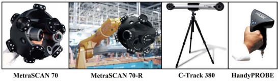 The MetraSCAN 70, MetraSCAN 70-R, and HandyPROBE (Figure 2) are manufactured by Creaform, a Canadian company. The MetraSCAN 70 and 70-R are almost identical optical scanners. The main difference is in the compatibility of the R version with the mechanical arm, but only with the KR5 Arc product line from KUKA. In this configuration, the measuring system is not affected by the accuracy of the arm. The second difference is their weight; the lighter version of MetraSCAN 70 is designed for manual handling, so it is characterized by high portability. A necessary part of both scanners is the C-Track 380 position evaluation system and the VXelements software (data collection), which can be connected to the Metrolog X4 i-Robot software with more sophisticated measurement evaluation tools.
