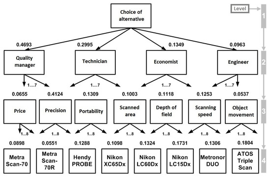 The last step in the analysis is to process the matrices of pairwise comparisons, in which every product is assessed according to each criterion for product assessment (Table 8). The considered variants are as follows: MetraSCAN 70 (), MetraSCAN 70-R (, HandyPROBE (), Nikon XC65Dx (), Nikon LC60Dx (), Nikon LC15Dx (), Metronor DUO (), and ATOS Triple Scan ().