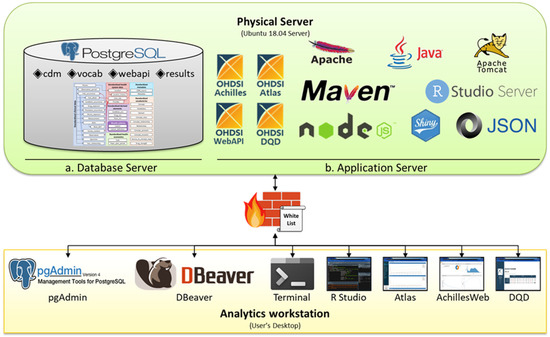 To set up the OHDSI OMOP CDM environment, computing environments should be considered: DB server and analytics workstation [5]. The DB server stores medical data in the CDM format, while the OMOP CDM DB server can be run by a wide range of DB management systems (DBMS), including conventional DB systems (PostgresSQL, Microsoft SQL Server, Oracle, etc.), parallel data warehouses (Microsoft APS, IBM Netezza, Amazon RedShift, etc.), and big data platforms (Hadoop, Google BigQuery) [5]. PostgreSQL is officially supported by conventional DB systems [24]. The research methodology library runs on the analytics workstation, which can be a local system, such as a user’s laptop or a remote server running an RStudio Server. Allocating multiple processing cores and sufficient memory can help speed up the analysis because the analysis workstation has several computationally intensive jobs. In addition, the analytics workstation should be connected to the DB server, and multiple researchers should be able to access it simultaneously in their own connection environment. In particular, the DB server access port should be opened to the analytics workstation, such that the firewall between the 2 can be connected [5].