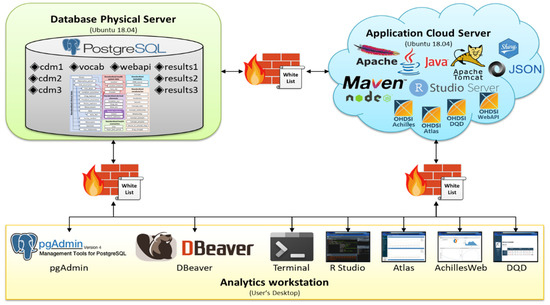 The separated server design builds the DB and AP servers on 2 physical servers. Figure 2 presents a design adopted by 1 tertiary hospital and 2 secondary hospitals in Korea, showing a case of establishing an OHDSI OMOP CDM environment by installing a DB server in 1 physical server and an AP server in the other cloud server. Because these hospitals could support the computing resources of 1 physical server and 1 cloud server, they adopted a separate server design that was built separately from the DB and AP servers. There were firewalls between the physical server, cloud server, and analytics workstation, and they have a safelist, such that they only allow specific IPs.