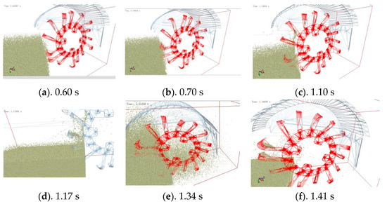 - Discrete element simulation was carried out on the ditching device by EDEM simulation software, and the action mechanism between soil particles, ditching blade and fairing was obtained in simulating ditching operation. Make it clear that the trenching process. The movement of soil particles in the deflector hood under the action of the blade, the conclusion is consistent with the results of the theoretical analysis. When opening the trench, some of the soil continued to move in a circle with the cutter head, and some was thrown out of the ditch; meanwhile, it can be seen that as soon as one blade crossed the soil and continued the trenching, another blade came into contact with the soil, indicating that there was overlapping soil cutting section between adjacent ditching blades, a large number of soil began to move in a circle with the cutter head. When it was lifted to a certain height, some soil particles were thrown out of the cutter head and collided with the fairing, and then were thrown out. Furthermore, due to low viscosity and fineness of sandy soil, not all soil will collide against the fairing. Therefore, some soil will still escape from the seams of fairing.