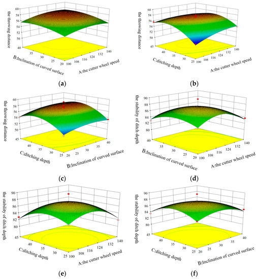 - Cutter speed, ditching depth and the inclination of curved surface on the throwing distance and the stability of ditch depth were obtained through soil trough test. For the stability of ditch depth, the ditch depth was smaller than the cutter wheel speed and the inclination angle. Ditching depth also has the greatest influence on the stability of ditch depth. The order of the influence of each factor on the soil throwing distance is ditching depth > inclination of curved surface > cutter speed, and the order of the influence on the stability of the ditch depth is ditching depth > cutter speed > inclination of curved surface. At a certain ditching depth, the influence of both inclination of curved surface and cutter speed on the throwing distance and the stability of ditching depth increased first and then decreased, and the influence of cutter speed was greater than that of the inclination of curved surface. For the soil throwing distance, it has the greatest influence on the soil throwing distance. It further shows that the ditching depth has the most important influence on the soil throwing distance and the stability of the ditch depth of the trenching equipment. The quadratic orthogonal regression rotation combination experiment method was designed. The device test was carried out by taking cutter speed, ditching depth and inclination angle of the fairing surface as the influencing factors, and the throwing distance and the stability of ditch depth as the test indexes, to obtain the optimized working parameters. the optimized operating parameters of the ditching device are as follows: the cutter wheel speed is 119.61 r·min−1, the inclination of curved surface is 30.07°, the ditching depth is 35.52 mm, the soil throwing distance is 58.33, and the stability of ditch depth is 86.51, which were basically consistent with the expected results of the optimization test. The combination parameters were obtained by experimental optimization. This optimization method herein is quite effective in seeking the quantitative law between test indexes and each factor. It will help identify the optimal portfolio of factors that is close to theory.