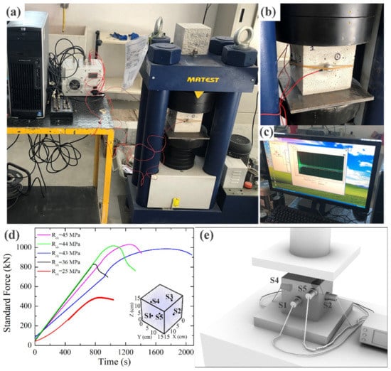 (a) Experimental setup. (b) Detail of the specimen under test with mounted sensors. (c) Control panel with acquired AE signals. (d) Experimental load-vs-time diagrams for the concrete specimens having different values of Rck ranging between 25 and 45 MPa. Inset: Schematics of the sensors layout. (e) A sketch of the acquisition system.