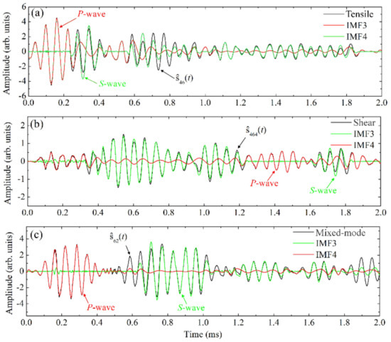 Examples of the time domain trace (black line), P-wave (red line) and S-wave (green line) waves as extracted with the HHT from AE waveforms related to different failure events: (a) tensile, (b) shear and (c) mixed-mode, respectively.