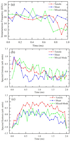 Instantaneous frequency (a) for tensile (red line), shear (blue line) and mixed-mode (green line) as calculated from the signals represented in Figure 4a. Plot of spectral entropy (b) and spectral kurtosis (c) as calculated on the same signals.