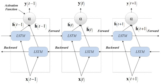 Then, the complete Bi-LSTM hidden element representation h(t) is the concatenated vector of the outputs from both forward (Equation (7)) and backward (Equation (8)) processes, such that: