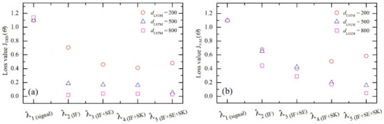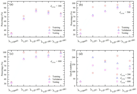 Figure 8a–c summarizes the effect of the number of dLSTM (or hidden units) on classification accuracy (i.e., ratio between the number of correctly classified events and the total number of events in the considered dataset, in percentage) for the training, validation and test dataset (testing) of the proposed model (dLSTM = 200 in Figure 8a, dLSTM = 500 in Figure 8b, and dLSTM = 800 in Figure 8c). Here, we can observe that the performance of this model is better as the number dLSTM increases under the defined range (dLSTM = [200–800]), while it does not undergo saturation or degradation as the scale becomes larger. A value of dLSTM = 500 provides the best testing performance with an accuracy of 92% (by combining IF, SE and SK). The reason is that the Bi-LSTM model with fewer LSTM cells suffers from lack of capability of long-term memory, which will result in under-fitting, whereas a model too large (i.e., higher number of hidden cells) will always lead to increasing difficulty due to over-fitting. In Figure 8d, we show the validation performance of Bi-LSTM models in terms of epochs (required to complete the training) for different numbers of cells and inputs (λ1–λ5). After the training is completed, the model has learned the patterns necessary for the classification of the input events. As expected, the epoch number Ɛ of each model is different, depending on the choice of dLSTM, and the input configuration λr. We also observed that varying λr does not significantly impact on the computing time. This is because the training job is mainly affected by both the size Q of the training dataset, and the complexity of the network dLSTM during weights updating and gradient propagation. We only adopted the parameter matrix Θ that generates the lowest J(Θ) on the input dataset and collected the value of J for both training, JTRN(Θ), and validation JVAL(Θ). The training, validation and testing accuracies increase with λr when dLSTM is higher than 200 LSTM cells. For dLSTM = 200, a local minimum in validation loss is observed with λr = λ3 (which implies using a combination of IF and SE for each acoustic signal). Epoch number Ɛ tends to decrease with dLSTM. As expected, the Ɛ required for the calculation of the three different statistical measures λ5 (which implies using IF, SE and SK for each signal) is the lowest.