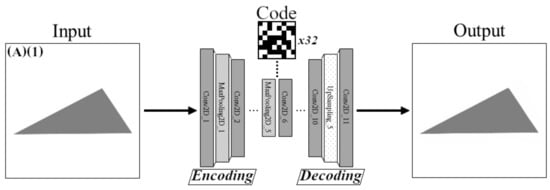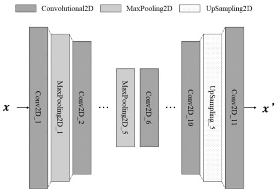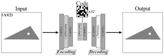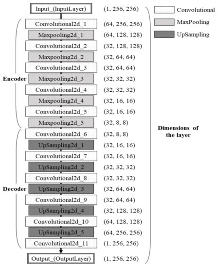 The encoding phase compresses inputs from 65,536 values to 2048. Then, the decoding phase decompresses these encoded data to outputs made of 65,536 values. The sizes of the data, as well as their dimensions, change according to the filters and the operation they perform at every layer of the network. A filter can either reduce (max pooling layer) or stretch (upsampling layer) the size of data, while both the size and the dimensions are reshaped through convolutional layers. The dimension and the size of the data are indicated on the right of the layers in Figure 10. For example, data at the input and output layers are both made of 65,536 values (1 × 256 × 256), while they are made of 2048 values (32 × 8 × 8) at the end of the encoding phase.