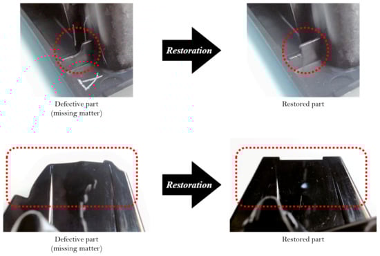 The Figure 3 presents typical flawed pieces and their flawless counterparts. These pictures are for illustration purposes; no actual restoration was performed, these are results sought in our study.