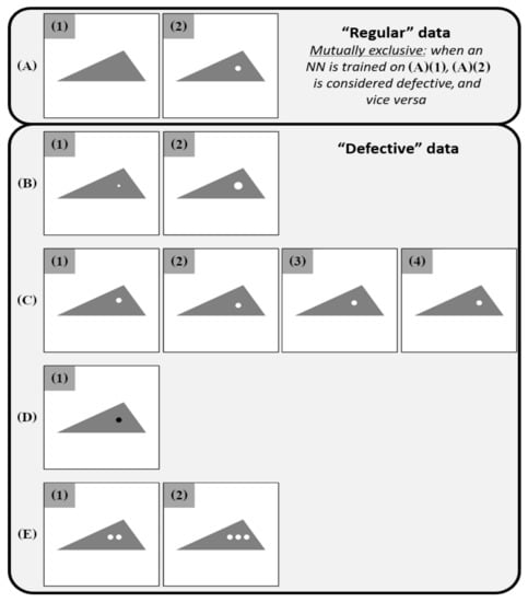 Two categories are considered “regular”: spotless triangles (A)(1) and spotted triangles (A)(2). However, only one at a time can be used during the training phase of a model, the other is then considered “defective” during its testing phase. Additionally, some datasets ((B), (C), (D), (E)) are “defective”, regardless of the data used to train the model and are always used for testing purposes. They are made of spotted triangles whose spots are generated depending on several parameters, such as: their size (B), position (C), color (D) and count (E), which result into 9 defect patterns. Only a few defects were simulated, as there are a lot of parameters to take into consideration, we had to narrow down our attention and decided to examine a limited number of flaws characterized by one abnormal parameter at a time, instead of combinations. Some examples are displayed in Figure 7.