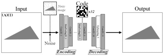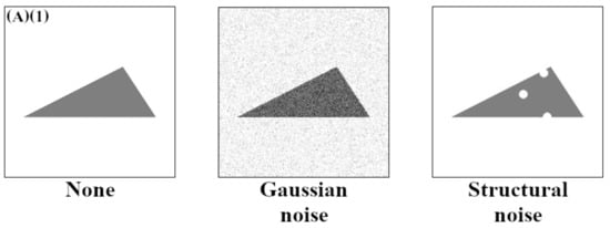 Since defective data are uncommon, being able to prepare these NNs from regular data is an advantage: it is laborious to form proper/relevant training datasets from scarce resources. In addition, it is known that the reduction/restoration ability of convolutional autoencoders is improved by the addition of noise to the input layer and the hidden layer [,]. Therefore, our study intended to determine what kind of noise should be used to get the best performances. Experiments involving no noise, Gaussian noise and a noise made of a known structure were conducted.