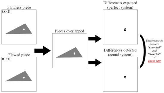 The error rates of differences were calculated to evaluate the exactitude of the detections. Because differences are closely related to defects: the smaller the error rate, the more accurate the defect detection (and conversely). The formula used to compute the error rates is shown in Equation (1):