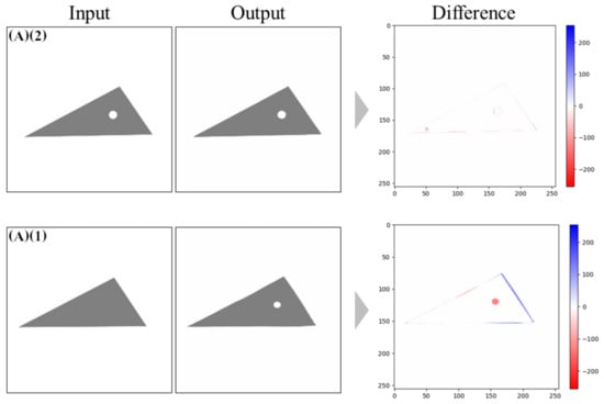The Figure 15 also shows the differences between the output and the input, after the restoration process. The color pattern is the same as the previous input/output comparisons.No particular discrepancies were observed when the inputs were similar to what the CAE is familiar with (spotted pieces), while the dissimilarities of spotless pieces were clearly highlighted. The red disc corresponds to the “missing” spot of the spotless input that was created, as the NN was not trained on data excluding this feature. Once again, some subtle differences were noticed for the same reasons mentioned in the previous case.