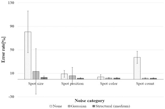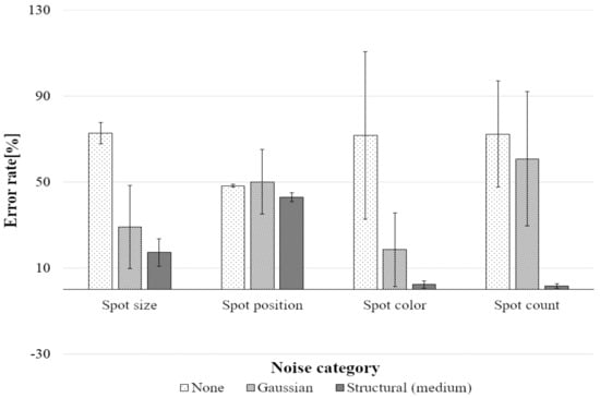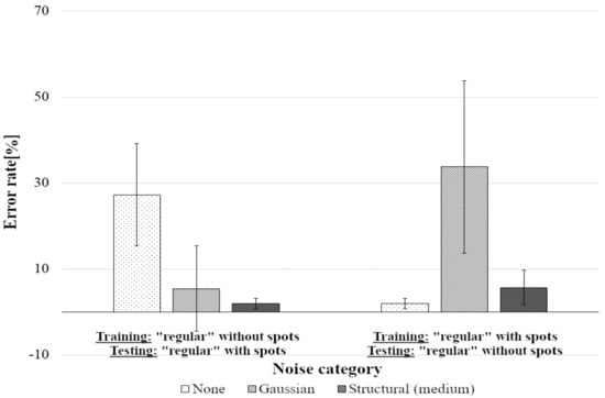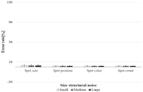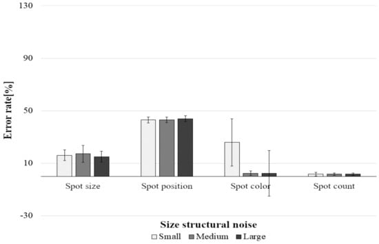 On the other hand, in a similar way, the models trained on spotted data gave mixed results. The error rates were substantial for defective spot sizes and even more problematic for defective spot positions, while low error rates were increased from the tests on samples with flawed spot colors and counts. In addition, concerning standard deviations appeared for the error rates when images with flawed spot colors where processed by the models trained on small and large noise structures.