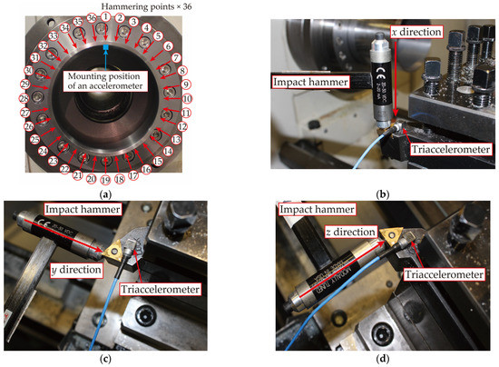 Impact tests for the workpiece and the cutting tool were conducted to identify their modal parameters. An accelerometer (Ono Sokki, NP-2106 (Kanagawa, Japan)) was attached to the tip of the workpiece in the radial direction and 36 hammering points at a regular pitch of 10°, were selected to measure the workpiece vibration modes using an impact hammer (PCB Piezotronics, Inc, 086C01 (Depew, NY, USA)) as portrayed in Figure 2a. A triaxial accelerometer (PCB Piezotronics, 356A03 (Depew, NY, USA)) was attached to the tip of the cutting tool and the frequency response functions of the cutting tool for 3 hammering directions were respectively measured using an impact hammer (PCB Piezotronics, Inc, 086C01 (Depew, NY, USA)) as depicted in Figure 2b–d. The overhang length of the tool from the tool stand to the tip of the tool was 25 mm.