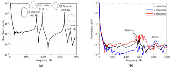 Frequency response functions: (a) Workpiece frequency response function for a 4.0 mm wall thickness of the workpiece; (b) Tool frequency response function in x, y, and z directions.