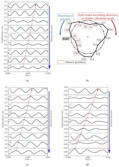 The waveforms of the workpiece vibration displacement in measuring points 1 to 9 during chatter generation are shown in Figure 5a for a 4.0 mm wall thickness of the workpiece. The frequency analysis of the workpiece vibration displacement during chatter generation (Figure 5a) indicated that the chatter frequency was 1995 Hz, which was approximately equal to the natural frequency of the (3, 1) mode of the workpiece (Figure 3a; Table 1). As observed from Figure 5a, the phase was almost inverted in comparison to the vibration waveforms of measuring points 2 and 4 or those of 5 and 7. The chatter vibration mode displayed in Figure 5b was obtained by interpolating the 9 measured vibration displacements, considering the symmetry of the workpiece vibration mode. The chatter vibration mode displayed in Figure 5b corresponds well with the (3, 1) mode exhibited in Figure 3a. The blue arrows in Figure 5a,b represent the rotational direction of the workpiece, whereas the red-dashed arrow in Figure 5a plots the position of the antinode of the workpiece vibration at each measurement point. As indicated in Figure 5a, the antinode positions travel in the direction opposite to the workpiece rotation with time. Therefore, the chatter vibration mode was observed to travel in the direction opposite to the workpiece rotation, as indicated by the red arrow in Figure 5b. In particular, the chatter vibration mode was not fixed in space. The waveforms of the workpiece vibration displacement in measuring points 1 to 9 during chatter generation are shown in Figure 5c,d for a 2.6 mm and a 1.5 mm thick wall, respectively. As observed from Figure 5c,d, the chatter vibration modes for the other 2 thick walls rotate asynchronously with the rotation of the workpiece, the same as the case of a 4 mm thick wall, displayed in Figure 5a.