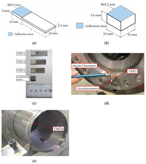 Based on the actual operating vibration measurement results during chatter generation, the shell mode with circumferential nodes was the dominant workpiece vibration mode. In the present study, the TMDs were attached to the inner surface of the rotating workpiece using double-sided tape for the metal. The dimensions of the TMDs are presented in Figure 6a. In general, TMDs are cantilevered beams with varying natural frequencies based on the beam length. The cantilever beam length l in Figure 6a was set to l = 19, 21.5, 24 mm. Moreover, an additional mass of approximately 5.0 g is depicted in Figure 6b almost equal to that of the TMD. The TMDs and the masses are made of carbon steel (C45). The masses are attached to the workpiece instead of the TMDs to compare the vibration characteristics of the workpiece and the chatter suppression effect. To install the TMDs or the masses inside the cylindrical workpiece, the curvature of the bonded part of the TMDs and the masses were altered to match the inner diameter of the workpiece, as portrayed in Figure 6a,b. The picture of the mass and the TMDs are presented in Figure 6c. An impact test of the TMDs, fixed to the ring jig with double-sided tape as depicted in Figure 6d, was conducted using an impact hammer (PCB Piezotronics, Inc, 086E80 (Depew, NY, USA)) under the boundary condition of the cantilevered beam to identify the modal parameters of the TMDs. An accelerometer (Ono Sokki, NP-2106 (Kanagawa, Japan)) was attached to the tip of the TMD with an adhesive. The natural frequencies and the damping ratios of the TMDs were obtained by curve fitting the measured frequency response function for each beam length of the TMD presented in Figure 7. The beam length l of the TMD, natural frequency fd, damping ratio ζd, and actual mass m of each TMD are presented in Table 4. A picture of the TMDs attached to the workpiece is presented in Figure 6e. The number of TMDs or masses was set to 3 or 4 to minimize the imbalance and deformation of the workpiece resulting from the centrifugal force. The TMDs with the same beam length l were manufactured such that their mass and natural frequency were equal. The mass of the workpiece was 2097 g. The mass ratio of the TMD or the additional mass to the workpiece was approximately 0.2%.