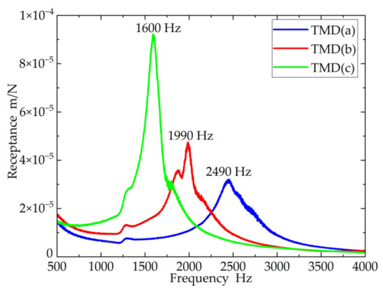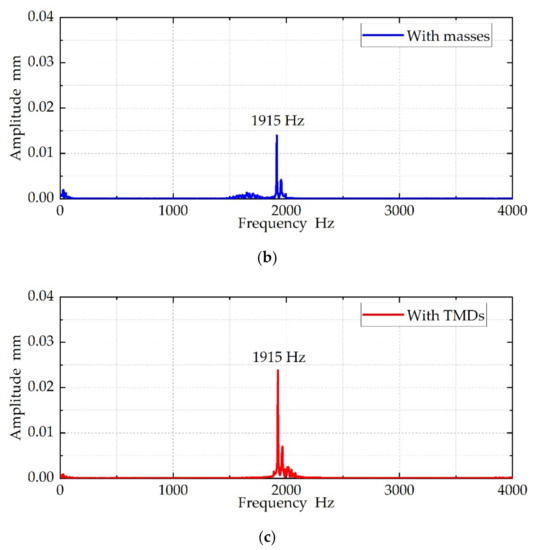 Frequency analysis of workpiece: (a) Without TMDs; (b) With masses (mounting arrangements: θ1 = θ2 = 120°, ld = 35 mm); (c) With TMDs (mounting arrangements: θ1 = θ2 = 120°, ld = 35 mm).