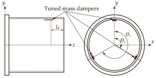 According to the experimental results presented in Section 2.3, the shell mode with 6 nodes in the circumferential direction was the predominant chatter vibration mode for the workpiece wall thickness of 4 mm. In a previous study [27], the vibration amplitude during chatter generation was reduced when three TMDs with a mass ratio of 1.5% to the workpiece mass were attached to the workpiece tip at an equal pitch in the circumferential direction. In addition, prior research has demonstrated that the installation of an additional mass with a mass ratio of 1.5% could reduce chatter vibration. Therefore, it was suggested that the chatter was reduced by the added mass rather than the influence of the TMD, for a sufficiently large mass ratio. However, the negative impacts of centrifugal forces, such as increased runout and deformation of the workpiece, become a concern if a large mass is added to a thin-walled cylinder. In the present study, the influence of the mounting position and the tuning parameters of the TMDs on chatter was investigated for extremely small mass ratio of the TMD (mass ratio of approximately 0.2%). The circumferential installation pitch of the TMDs or the masses was defined as the mounting angle θ1 and θ2 based on the TMDs or the masses mounted on the y-axis, as depicted in Figure 8. In particular, the mounting position of the TMDs or the masses in the z-axis direction was defined as the distance ld from the workpiece tip.