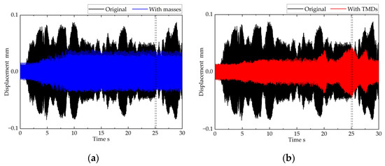 Vibration displacement of workpiece at 2 measurement point during cutting: (a) Without and with masses (mounting arrangement: θ1 = θ2 = 120°, ld = 35 mm); (b) Without and with TMDs (mounting arrangement: θ1 = θ2 = 120°, ld = 35 mm).