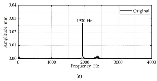 First, the chatter suppression effect was examined when three TMDs or three additional masses were installed at equally spaced positions in the circumferential direction the same as the mounting arrangement of the TMDs in the previous study [27]. The mounting angle of the TMDs or the masses in the circumferential direction were θ1 = θ2 = 120°. The mounting positions of all the TMDs or all the masses along the z-axis were ld = 35 mm. The natural frequencies of the adopted 3 TMDs were 1990 Hz close to the chatter frequency of (3,1) mode. The workpiece vibration waveforms measured by the eddy current sensor of #2 measuring point with and without the masses or TMDs are illustrated in Figure 9, which shows that the workpiece vibration amplitude during the chatter generation is reduced by adding the masses or TMDs; however, the chatter cannot be completely controlled. Figure 10 depicts the frequency analysis results of the workpiece vibration displacement with and without the masses or TMDs during cutting, 25 s after the initiation of cutting (at 7.6 mm from the workpiece tip). As observed from Figure 10b,c, the chatter frequency was observed upon attaching the masses or TMDs. Compared to the case of the mounted TMDs with a mass ratio of 1.5% arranged at an equal pitch in the circumferential direction in the previous study, the installation of the TMDs with a mass ratio of 0.2% did not reduce the chatter vibration very well.