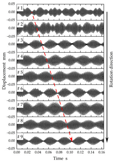 Figure 11 displays the results of enlarging the workpiece vibration waveforms at nine measuring points of the eddy current sensors during a single rotation cycle when the TMDs were installed. As indicated by the red-dashed arrows in Figure 11, the position corresponding to the vibration nodes at the nine measurement points moved forward by half a rotation in 0.08 s, which is half of the rotation period. Therefore, the period and direction of movement of the nodes coincided with the period and direction of rotation of the workpiece. In addition, the number of nodes during a single rotation cycle in the vibration waveform of each measurement point is six, which is consistent with the number of nodal diameters in the (3,1) mode of chatter vibration. The results of the workpiece vibration waveforms (Figure 11) suggest that the chatter vibration mode rotated in synchronisation with the workpiece rotation. We presumed that the chatter could not be completely suppressed since the mounting positions of the TMDs or the masses coincided with the positions of the nodes of the (3,1) mode of chatter vibration.