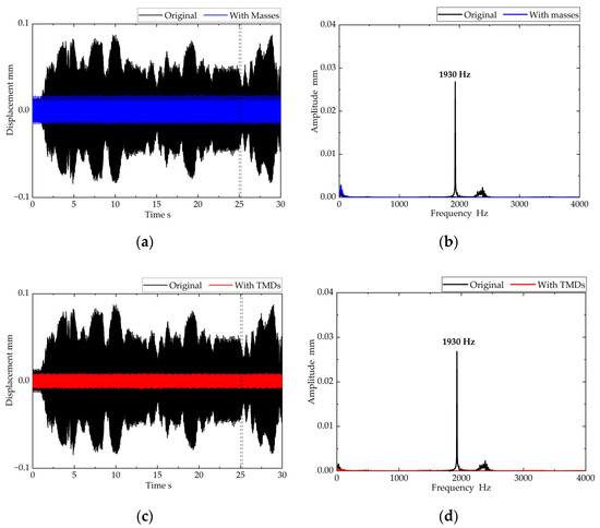 Workpiece vibration displacement at number 2 measurement point during cutting. Comparison of (a) vibration waveforms with and without masses (mounting arrangements: θ1 = 110°, θ2 = 220°, ld = 35 mm), (b) frequency analysis with and without masses (mounting arrangements: θ1 = 110°, θ2 = 220°, ld = 35 mm), (c) vibration waveforms with and without TMDs (mounting arrangements: θ1 = 110°, θ2 = 220°, ld = 35 mm), and (d) frequency analysis with and without TMDs (mounting arrangements: θ1 = 110°, θ2 = 220°, ld = 35 mm).
