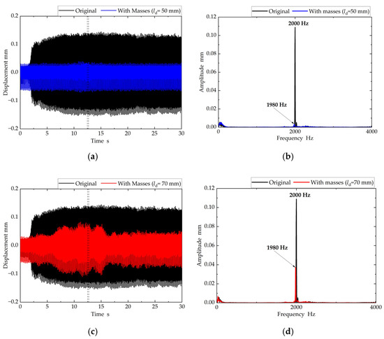 Workpiece vibration displacement at number 2 measurement point during cutting without and with masses. Comparison of (a) vibration waveforms with and without masses (mounting arrangements: θ1 = 110°, θ2 = 220°, ld = 50 mm), (b) frequency analysis with and without masses (mounting arrangements: θ1 = 110°, θ2 = 220°, ld = 50 mm), (c) vibration waveforms with and without masses (mounting arrangements: θ1 = 110°, θ2 = 220°, ld = 70 mm), and (d) frequency analysis with and without masses (mounting arrangements: θ1 = 110°, θ2 = 220°, ld = 70 mm).