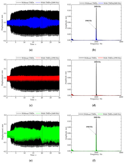 Workpiece vibration displacement at number 2 measurement point during cutting without and with TMDs (mounting arrangements: θ1 = 110°, θ2 = 220°, ld = 70 mm). Comparison of (a) vibration waveforms without and with TMDs (fd1 = fd2 = fd3 =2490 Hz), (b) frequency analysis without and with TMDs (fd1 = fd2 = fd3 = 2490 Hz), (c) vibration waveforms without and with TMDs ( fd1 = fd2 = fd3 = 1990 Hz), (d) frequency analysis without and with TMDs (fd1 = fd2 = fd3 =1990 Hz), (e) vibration waveforms without and with TMDs (fd1 = fd2 = fd3 = 1600 Hz), and (f) frequency analysis without and with TMDs ( fd1 = fd2 = fd3 = 1600 Hz).
