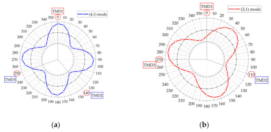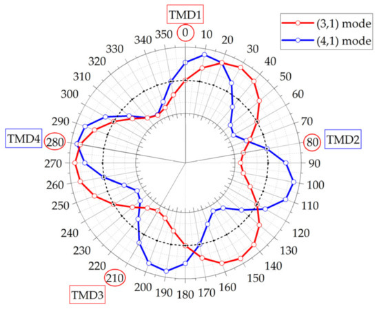 The results presented in Figure 16 and Figure 17 suggest that at least two TMDs with natural frequencies close to the chatter frequency of each mode are required to suppress the chatter of each mode. Therefore, the suppression effect of multiple chatter modes was examined by respectively installing two TMDs with natural frequencies close to chatter frequencies of (3,1) mode and (4,1) mode. The circumferential installation pitches of the four TMDs tuned to the (3,1) and (4,1) modes were determined such that they did not coincide with the pitch of the nodes of the (3,1) and (4,1) modes, respectively. The natural frequencies and circumferential installation pitches of each of the four TMDs are listed in Table 6. The circumferential mounting arrangement of the TMDs were superimposed on the (3,1) and (4,1) modes of chatter, as depicted in Figure 18. Moreover, the position of each TMD in the z-axis was ld = 35 mm from the workpiece tip.