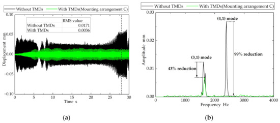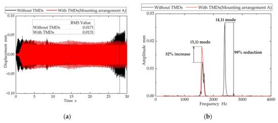 A comparison of the workpiece vibration waveforms measured by the eddy current sensor of #2 measuring point with and without the TMDs during the turning process for mounting arrangement A is presented in Figure 16a. In addition, the root mean square (RMS) values of the workpiece vibration displacement with and without the TMDs from the start time to the end time of cutting are displayed in Figure 16a. The frequency analysis of the time waveform for the 0.05 s period in the initial 28 s after cutting (vertical dotted line in Figure 16a) is presented in Figure 16b. The results presented in Figure 16 suggest that the (4,1) mode chatter can be suppressed even when the number of the TMDs with natural frequencies close to the (4,1) mode chatter frequency is 2. On the other hand, the (3,1) mode chatter vibration cannot be suppressed when only 1 TMD with a natural frequency close to the (3,1) mode chatter frequency is used.