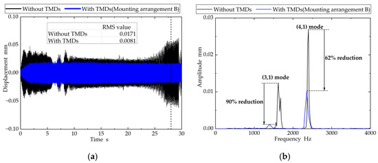 Workpiece vibration displacement at number 2 measurement point for mounting arrangement B: Comparison of (a) vibration waveforms with and without TMDs, (b) frequency analysis with and without TMDs.