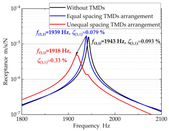 Next, the workpiece frequency response with the TMDs arranged with a regular pitch (TMD mounting arrangement in Figure 9b) and an irregular pitch (TMD mounting arrangement in Figure 12c) in the circumferential direction along with the workpiece frequency response without the TMDs are presented in Figure 20. It can be seen from Figure 20 that the peak of the natural frequency of the (3,1) mode related to the chatter mode in the case of the TMDs arranged with a regular pitch is almost the same as that of the original workpiece without the TMDs. In contrast, the peak becomes lower and the modal damping ratio is higher in the case of the TMDs arranged with an irregular pitch compared to that of the TMDs arranged with a regular pitch.