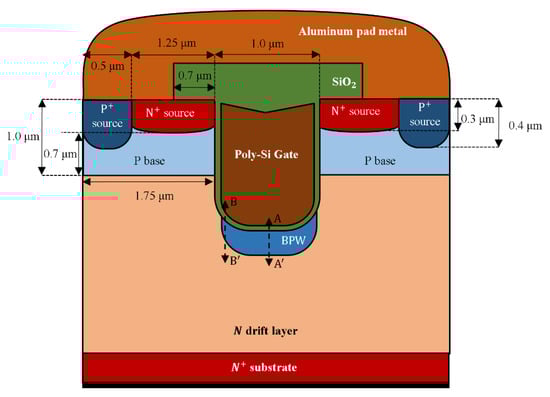 Figure 1 shows a cross-sectional view of the 1.2-kV 4H-SiC trench-gate MOSFET with a BPW structure. The 4H-SiC trench-gate MOSFET was constructed using Sentaurus TCAD simulation tools. The doping profiles of the P base, n+ source, p+ source, and BPW were formed by the Monte Carlo method. For a voltage rating of 1.2-kV, the drift doping concentration (Ndrift) and the drift thickness (tdrift) were 6 × 1015 cm−3 and 13 μm, respectively. These parameters determine the breakdown voltage using a punch-through diode model and consider the two-dimensional effect and the reduction in the effective thickness between the trench and n-drift length [21]. The doping concentration and depth of the n+ source, p+ source, and P base were 1 × 1020 cm−3, 1 × 1020 cm−3, and 3 × 1017 cm−3, respectively. The length and depth of n+ source, p+ source, and P base were 1.25/0.3 μm, 0.5/0.4 μm, and 1.75/0.7 μm, respectively. The width, depth, and slope of the trench were 1 μm, 2 μm, and 88°, respectively; the trench depth effectively prevented the degradation of the current flow from the JFET resistance. At the trench bottom, a p-type region for BPW was constructed using multi-implantation energies and a spacer thickness of 0.1 μm. The implantation energies and spacer thickness were considered to prevent lateral penetration of the trench sidewall. NBPW values from 1 × 1017 cm−3 to 3 × 1018 cm−3 were used to analyze electrical characteristics, and the contact metal was placed at the bottom of the trench to set BPW as ground [15,22].