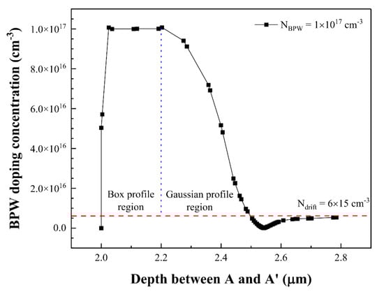 Figure 2. Depth profile of bottom protection p-well (BPW) doping concentration with NBPW of 1 × 1017 cm−3 including box profile and Gaussian profile in the cutline A-A’ section line of the device.