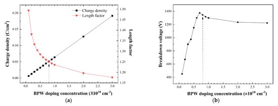 Figure 3. (a) Charge density, length factor, and (b) the breakdown voltage of the TMOSFET according to BPW doping concentrations.