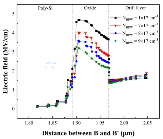 This means that the blocking voltage and gate oxide reliability were improved. However, along with the increase in the NBPW, the effective thickness of the drift layer was reduced. This was caused by the degradation of the length factor, where xj and W were increased and decreased, respectively. Therefore, the effect of the length factor reduces the breakdown voltage. In the case NBPW of 8 × 1017 cm−3, the cross point between the effect of the charge and that of the length factor with various NBPW was determined using the analytical method. This indicated that the gate oxide field was below 4 MV/cm. The electric field distributions of the trench corner in B-B’ for different NBPW are shown in Figure 4.