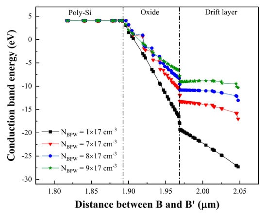 Figure 5 shows the conduction band edge energy profiles at the poly-Si/oxide/BPW interface in the B-B’ of the trench corner with various NBPW values under breakdown conditions. As NBPW increased, the conduction band energy of the BPW region increased. This indicates that the higher doping concentration is not fully depleted in the BPW region under the breakdown voltage, so that the gate oxide was protected from the crowding electric field. In the case of an NBPW value of 1 × 1017 cm−3, which was the lowest BPW concentration in the simulation conditions, the conduction band energy at the oxide region was pulled down. This means that a high electric field was applied at the edge of the trench gate oxide; consequently, a dielectric breakdown voltage was induced.